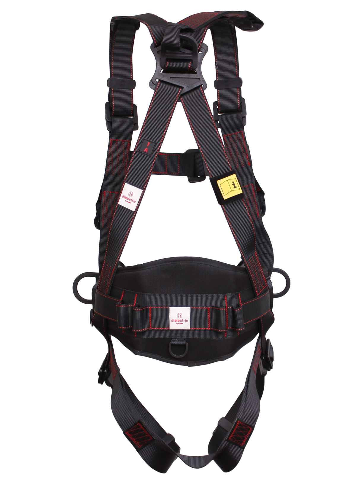Arnés **DIELECTRIC 4** para trabajos en altura con **riesgo eléctrico**. Incorpora **anilla dorsal** y **A/2 frontal**, **cinturón Expert‑3D** con **2 anillas laterales** y **4 cintas sujeta‑material**. Componentes metálicos con recubrimiento no conductor (ruptura **9 kV**). Ajuste en altura, pernera y cintura; incluye **bolsa impermeable Irusack 10**.