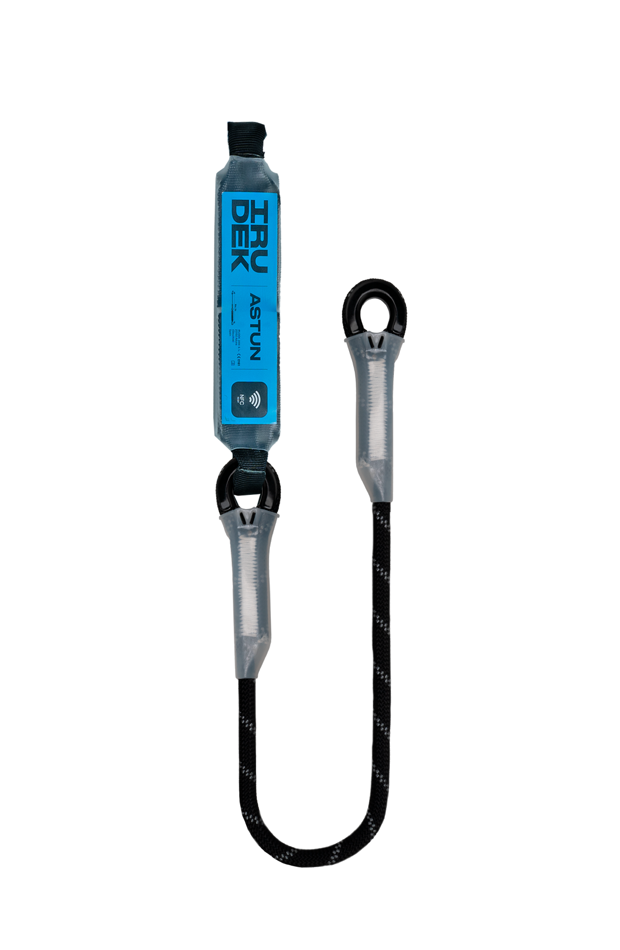 **ASTUN I 150 (361)**: elemento de amarre con **absorbedor de energía** y **cuerda simple** diseñado para soportar caídas y reducir la fuerza de impacto por debajo de **6 kN**. **Testado 140 kg** e incorpora **chip NFC Ready** para trazabilidad e inspección. Vida útil **10 años de uso + 2 de almacenamiento**.