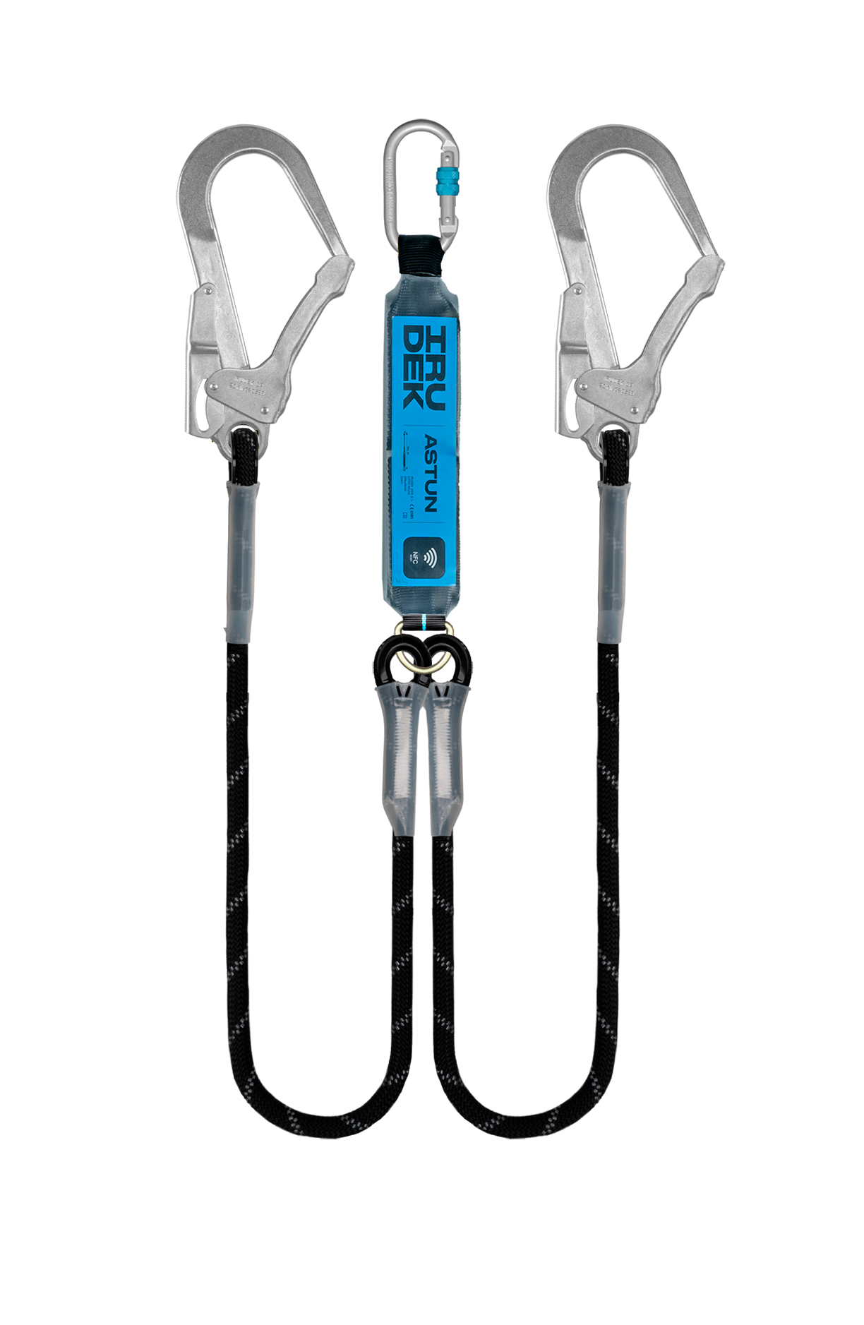 **ASTUN Y HSS (363)**: elemento de amarre con **absorbedor de energía** y **doble cuerda** de 12 mm para detención de caídas. Diseñado para reducir la fuerza de impacto por debajo de **6 kN** y testado para **140 kg**. Incorpora **chip NFC Ready** (Irucheck) para trazabilidad y revisión. Conectores: **Steelsafe 981** (screw‑lock 18 mm) + **2× Steelsafe 39** (due‑lock 50 mm). Vida útil **10 años de uso + 2 años de almacenamiento**.